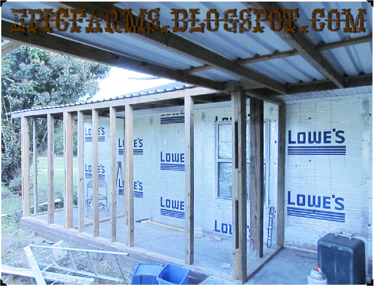 Finally! You have reached the happy ending to this post. DH and our favorite construction volunteer, Mr. Ron, have actually managed to have the same day off. *WOOT!* This has been forever in the making, and I know it's only framing but it is something in the way of progress, and I AM SO GLAD! (sorry for shouting - I'm terribly excited ;o) Look, it's an almost feed/tack room: